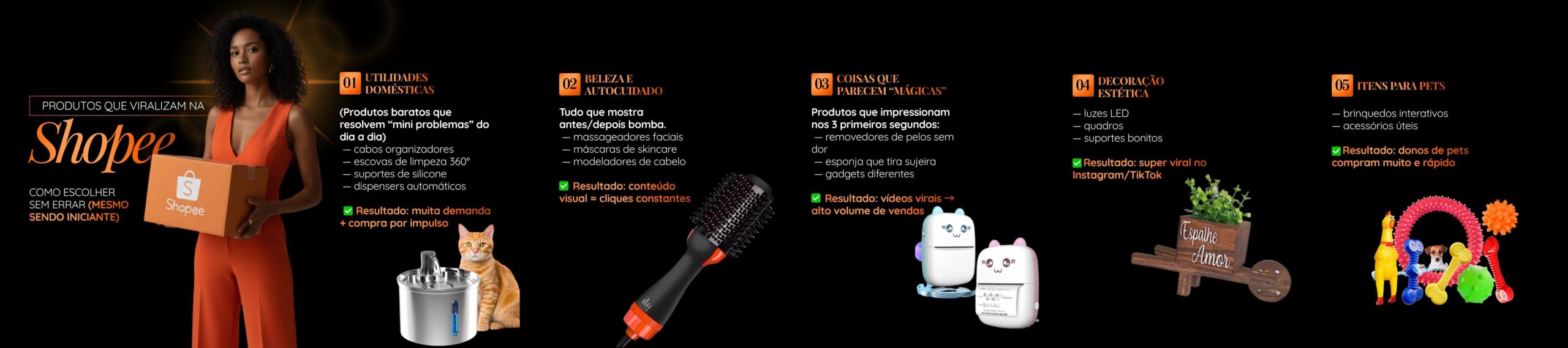 Um guia completo, organizado por categorias, com 150 produtos que viralizam na Shopee, TikTok e Reels para você criar conteúdos, encontrar produtos campeões e aumentar suas vendas como afiliado(a) de forma simples e rápida.